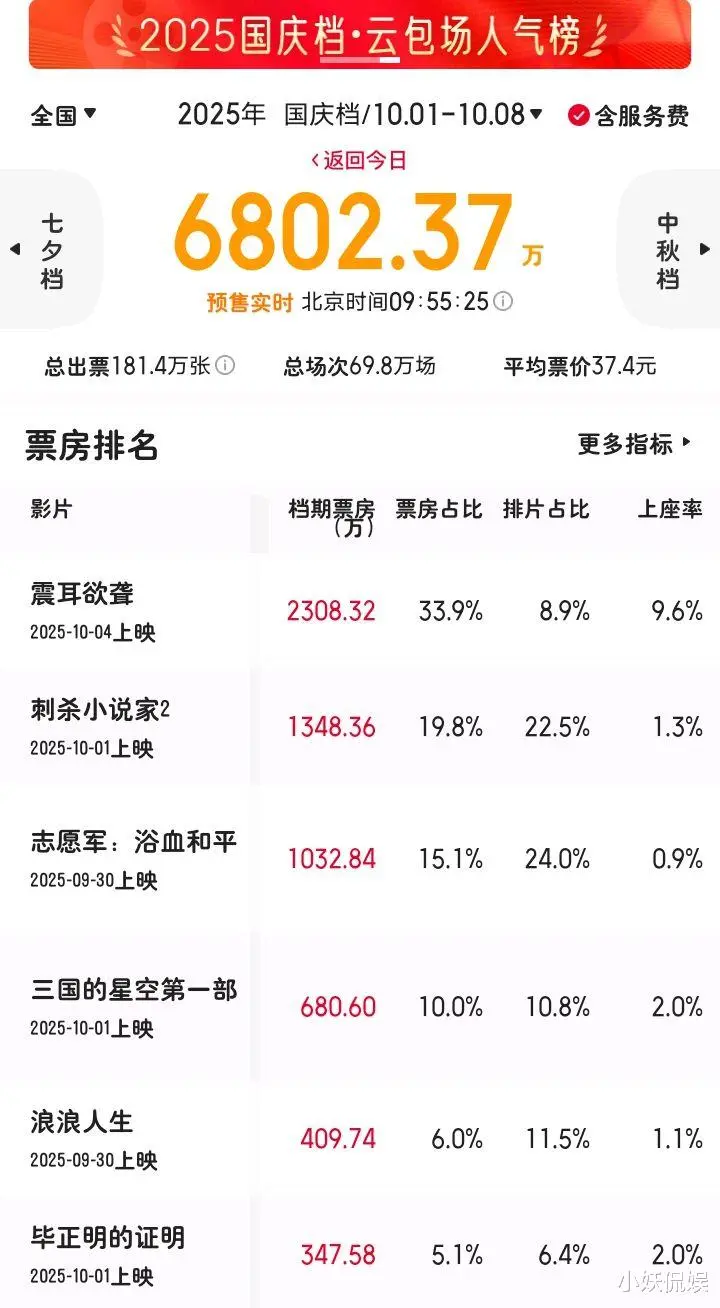 这种类型优势直接反映在 “上座率” 数据上:《震耳欲聋》以9.7% 的上座率领跑国庆档新片,意味着已有场次的购票转化率更高,观众 “想看就买” 的意愿更迫切。